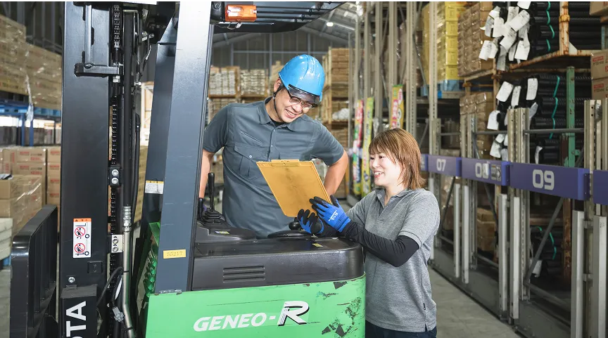 リフト等の点検を行い、出荷に向けた準備や前日に準備しておいた各拠点向けの製品の出庫作業を行います。